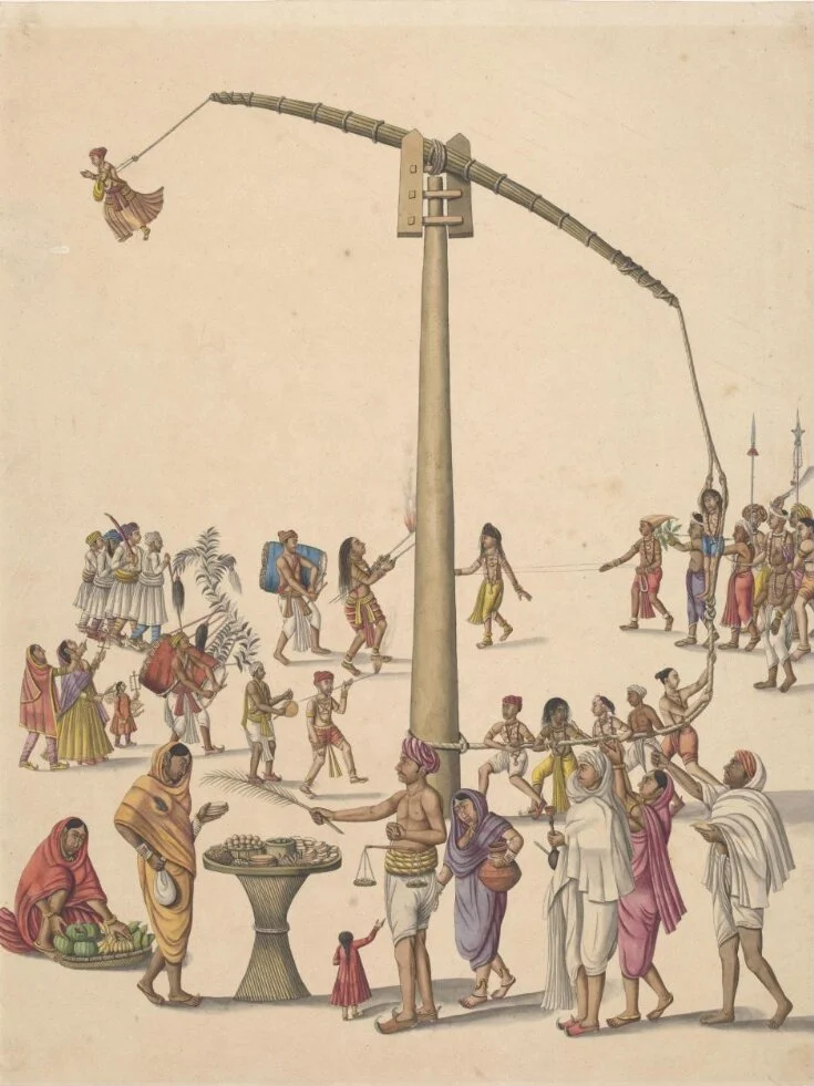 নীলষষ্ঠীর দিন চড়কগাছ জলাশয় থেকে তোলা হত। তারপর সংক্রান্তিতে শুরু হত আসল খেল… ঝুলঝাঁপ, বঁটিঝাঁপ, আগুনঝাঁপ, বাণফোঁড়া। ফ্যানি পার্কস্ থেকে হুতোম, মহেন্দ্রনাথ দত্ত, রাধারমণ মিত্রদের লেখায় উঠে এসেছে চড়কের নানান স্মৃতি। যেমন চড়ক দেখতে আসা লোকদের মধ্যে বাইবেল বিলি করে খ্রিস্ট ধর্মের মাহাত্ম্য প্রচার করতেন পাদরিরা। মহেন্দ্রনাথ দত্ত লিখছেন, ‘আমাদের জন্মের কিছু পূর্ব পর্যন্ত অথবা আমার জ্ঞান হইবার পূর্ব পর্যন্ত বাণ ফোঁড়ার প্রথা ছিল। চড়ক যেদিন হইবে, সেই দিন প্রাতে গাজনের সন্ন্যাসীরা কালীঘাট যাইত। যে কজন লোক বাণ ফুঁড়িবে তাহারা তৈয়ারী হইত। কে একজন বিশিষ্ট বলবান লোক ছিল সে গাজনের সন্ন্যাসীর পিঠে জোরে এক কিল মারিত, মারিলে পিঠ ফুলিয়া উঠিত। তখন বাঁ–হাতে পিঠের চামড়া টানিয়া ধরিয়া ডান–হাতে ধারাল বঁড়শির মত হুক বিঁধাইয়া দিত। পিঠে এইরূপ দুইটা বঁড়শি বিধাইত ও রক্ত বাহির হইত। কিন্তু সেই স্থানে গাওয়া ঘি গরম করিয়া মালিশ করিলে রক্ত পড়া বন্ধ হইত। আবার কেহ কেহ বা জিভেতে ফুটো করে এক বিঘত, দেড় বিঘত অশ্বত্থচারা শেকড়শুদ্ধ সেই জিভের ফুটোতে বসাইত।’ বাঙালির আবহমান কালের বিশ্বাস, কষ্ট করলে পুণ্যলাভ হয়। চড়কেও শরীরকে কষ্ট দেওয়া হত পুণ্যলাভের বাসনায়। পুনর্জন্ম পাওয়ার আশায়। সেখানে ধনীরা আবার টাকা দিয়ে সন্ন্যাসীদের চড়ককাঠে চড়কি খাওয়াত, ফ্যানি পার্কসের ভাষায় এর উদ্দেশ্য ছিল ‘প্রক্সি দিয়ে পুণ্যলাভ’।