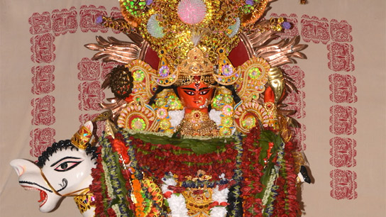 এখানে মায়ের মুখের রঙ শিউলি ফুলের কাণ্ডের মতো, দেবীর বাহন সিংহও ঘোটকমুখী।