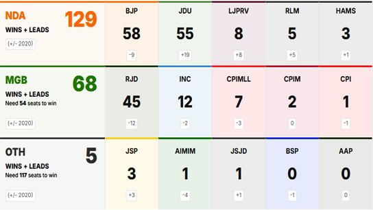 বিরোধী জোট ‘মহাগঠবন্ধন’-এর প্রাথমিক আভাসে এগিয়ে আছে ৫৭টি আসনে। তার মধ্যে এগিয়ে আরজেডি এগিয়ে ৪৪ আসনে। কংগ্রেস এগিয়ে আটটি আসনে।