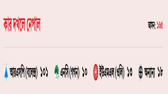 দলীয় সূত্রে জানা গেছে, রঞ্জু দর্শনা, গণেশ পারাজুলি এবং বিরাজ ভক্ত শ্রেষ্ঠা এই তিনটি আসনে জয়ী হয়েছেন। যদিও এখনও আনুষ্ঠানিক ফল ঘোষণা করেনি নেপালের নির্বাচন কমিশন। মোট ১৬৫টি আসন এফপিটিপি পদ্ধতিতে এবং বাকি ১১০টি আসন পিআর পদ্ধতিতে নির্বাচন হয় বৃহস্পতিবার। এফপিটিপি-র জন্য প্রতিদ্বন্দ্বিতায় করেন ৩৪০৬ জন প্রার্থী। পিআর-এর জন্য ছিলেন ৩১৩৫ জন। নেপালের সংবিধান প্রণেতাদের ব্যাখ্যা ছিল, দু’টি পদ্ধতি রাখার উদ্দেশ্য হল, পার্লামেন্টের নিম্নকক্ষে বিভিন্ন রাজনৈতিক দলের প্রতিনিধিদের অন্তর্ভুক্তি নিশ্চিত করা এবং সমাজে আনুপাতিক প্রতিনিধিত্ব বজায় রাখা।