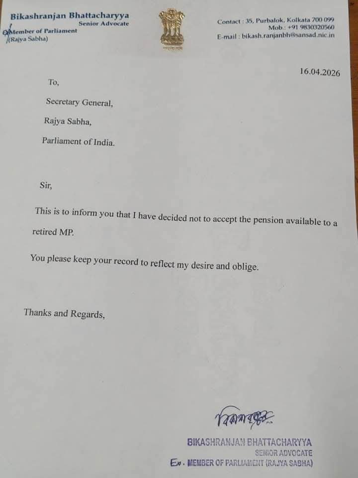 রাজ্যসভার প্রাক্তন সাংসদ হিসেবে যে মাসিক পেনশন পাওয়ার কথা, তা প্রত্যাখ্যান করলেন বিকাশরঞ্জন ভট্টাচার্য। ভোটের আগে বৃহস্পতিবার রাজ্যসভার সেক্রেটারি জেনারেলকে চিঠি লিখে নিজের এই সিদ্ধান্তের কথা জানিয়ে দিয়েছেন প্রবীণ আইনজীবী তথা যাদবপুরের সিপিএম প্রার্থী।