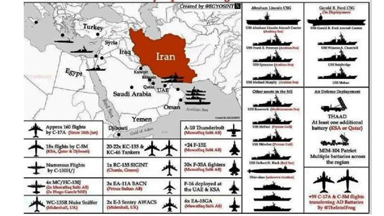 এখনই ইরানের ঘাড়ে নিঃশ্বাস ফেলছে ২টি এয়ারক্রাফট কেরিয়ার, ১২০টি যুদ্ধবিমান, অন্তত ১৭টি যুদ্ধজাহাজ। আর শুধু মধ্যপ্রাচ্যে তো নয়, ইরানে আঘাত হানতে ব্রিটেন, গ্রিস, বুলগেরিয়ার মতো ঘাঁটিতেও মোতায়েন রয়েছে একাধিক ভয়ঙ্কর বোমারু বিমান ও যুদ্ধবিমান। নজরদারি ও হামলায় সাহায্য করতে ই-৩ সেন্ট্রি AWACS সর্বক্ষণ ঘোরাঘুরি করছে। মজুত পর্যাপ্ত পরিমাণে MQ-4 Triton ও RQ-4 Global Hawk ড্রোন।