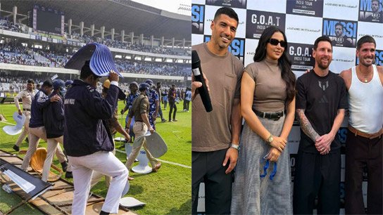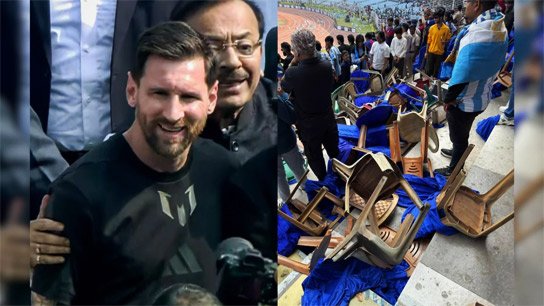 শুক্রবার রাতেই কলকাতায় চলে এসেছিলেন মেসি। সঙ্গে ছিলেন তাঁর ঘনিষ্ঠ বন্ধু তথা বিশ্ব ফুটবলের আরও দুই তারকা লুইস সুয়ারেজ় এবং রদ্রিগো ডি’পল। রাত আড়াইটে নাগাদ মেসির বিমান নামার পর কলকাতা বিমানবন্দরে ভক্তদের ভিড় এবং উন্মাদনা ছিল চোখে পড়ার মতো। সেই উন্মাদনা যে এমন ক্রোধের বিস্ফোরণ ঘটাবে, তা তখন আন্দাজ করা যায়নি। মেসিকে দেখতে না পেয়ে রাগে স্টেডিয়ামের চেয়ার ভেঙেছেন দর্শকেরা। ভাঙা চেয়ার, বোতল ছুড়েছেন মাঠে। পুলিশের ব্যারিকেড, ফেন্সিং ভেঙে হাজারে হাজারে দর্শক ঢুকে পড়েন মাঠে। মাঠে আগুন লাগিয়ে দেওয়ারও চেষ্টা হয়েছে! ফুটবলের রাজপুত্রকে শহর ছাড়তে হয়েছে বিক্ষোভের অস্বস্তি নিয়েই।