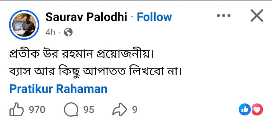 আগাগোড়াই কট্টর বামপন্থী মতাদর্শে বিশ্বাসী সৌরভ। তাঁর পরিচালনায় ‘অঙ্ক কী কঠিন’ সিনেমাটি সেরা ফিচার ফিল্মের পুরস্কার জিতেছে। তিনি মনে-প্রাণে বামপন্থী ভাবধারার অনুসারী। তাঁর একাধিক নাটকে সেই আদর্শ অনেক সময়ই ফুটে উঠেছে। এবার সেই সৌরভ লিখেছেন, “প্রতীক উর রহমান প্রয়োজনীয়। ব্যাস আর আপাতত কিছু লিখব না।”