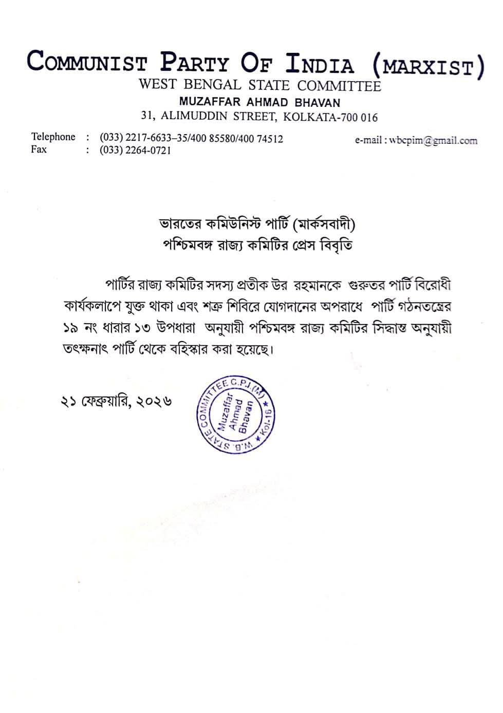 বাংলার বামেদের ‘কালবেলা’। একদিকে প্রতীক-উর রহমানের তৃণমূলে যোগদান ঘিরে তৈরি হওয়া অস্বস্তি। সেই অস্বস্তি থেকেই প্রতীক-উরের দলত্যাগের ৭২ ঘণ্টা পর বহিষ্কারের সিদ্ধান্ত। কিন্তু শান্তি নেই। কারণ, বহিষ্কারের বানান ভুল করে তৃণমূলী খোঁচার মুখে সিপিএম।