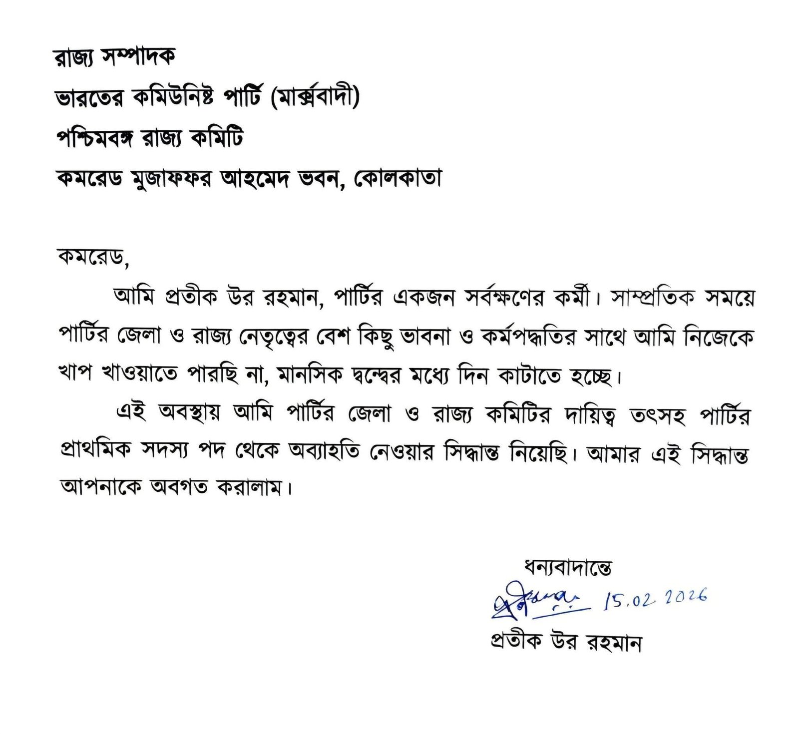 ভোটের আগে সিপিআই(এম)-এর রাজ্য রাজনীতিতে বড় চাঞ্চল্যের সৃষ্টি হয়েছে। পার্টির রাজ্য কমিটি থেকে আচমকা ইস্তফা দিয়েছেন প্রতীক উর রহমান। সূত্রের খবর, যদিও তাঁর এমন সিদ্ধান্তের কথাশীর্ষ নেতৃত্বকে একটি চিঠির মাধ্যমে জানিয়েছিলেন। চিঠিতে তিনি উল্লেখ করেছেন যে, পার্টির জেলা ও রাজ্য কমিটির দায়িত্বসহ প্রাথমিক সহসভ্য পদ থেকেও অব্যাহতি নিতে বাধ্য হয়েছেন।