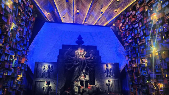 যা দেখে আপনি কখনও হারিয়ে যাবেন গ্যাংটকে, আবার কখনও জয়পুরে, আবার কখনও দার্জিলিং, আবার কখনও মুম্বই, লখনৌয়ে। আসলে সত্যজিৎ রায়ের ফেলুদা সিরিজের অন্যতম বৈশিষ্ট্যই হল প্রতিটি গল্পের প্রেক্ষাপট আলাদা। আর সেই জায়গাগুলোর ইতিহাস, সংস্কৃতি, ভূগোল গল্পের সঙ্গে ওতপ্রোতভাবে জড়িয়ে থাকে। একেকটা রহস্য আমাদের নিয়ে যায় একেক প্রান্তে। তাই যেন গোটা মণ্ডপে ধরতে চেয়েছেন শিল্পী সোমনাথ দাস, সহ-শিল্পী বিশ্বজিৎ পাল। সঙ্গে কাজ করেছে গোটা টিম।