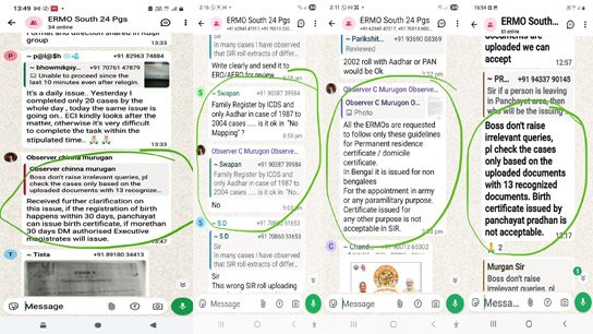 তাঁর আরও অভিযোগ, স্পেশাল রোল অবজারভার C. Murugan হোয়াটসঅ্যাপ গ্রুপে মাইক্রো অবজারভারদের বার্থ সার্টিফিকেটের গ্রহণযোগ্যতা নিয়ে সরাসরি নির্দেশ দিয়েছেন, যার উদ্দেশ্য ভোটার বাদ দেওয়ার সংখ্যা বাড়ানো।